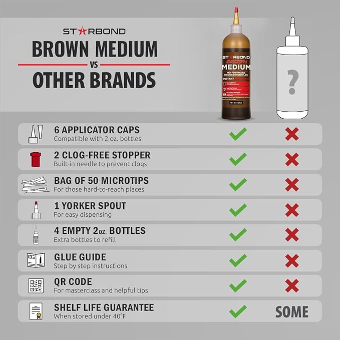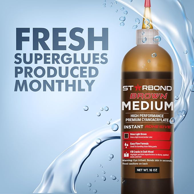 - ✅ PREMIUM CYANOACRYLATE SUPER GLUE - LAB TESTED FOR OPTIMAL PERFORMANCE: High performance industrial grade adhesive. This Medium Brown CA dries light amber in color, eliminating the need to use sawdust with CA glue.