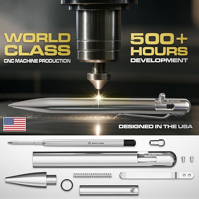 - Bolt Action Mechanism: With premium machined CNC precision design, BASTION pens bring together functionality and elegance. Our bolt-action technology offers a secure lock with no wearing components, as well as a smooth one-push operation. A sturdy body, effortless retractable system, and luxurious look make our pens a status symbol.