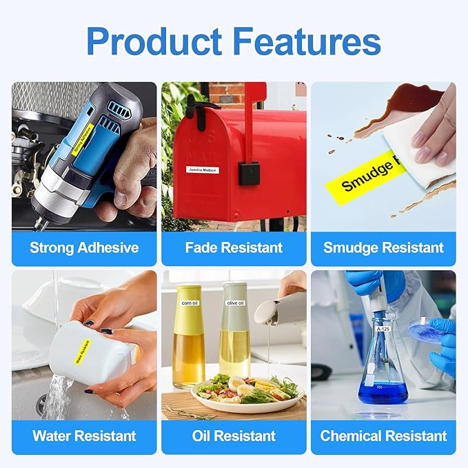 - Features: P-touch labels.It is laminated, durable,strong adhesive, anti-abrasion ,chemical resistant,withstands temperature ,fade and water resistant even in harsh conditions.It won't smudge or smear ,suitable for indoor and outdoor use