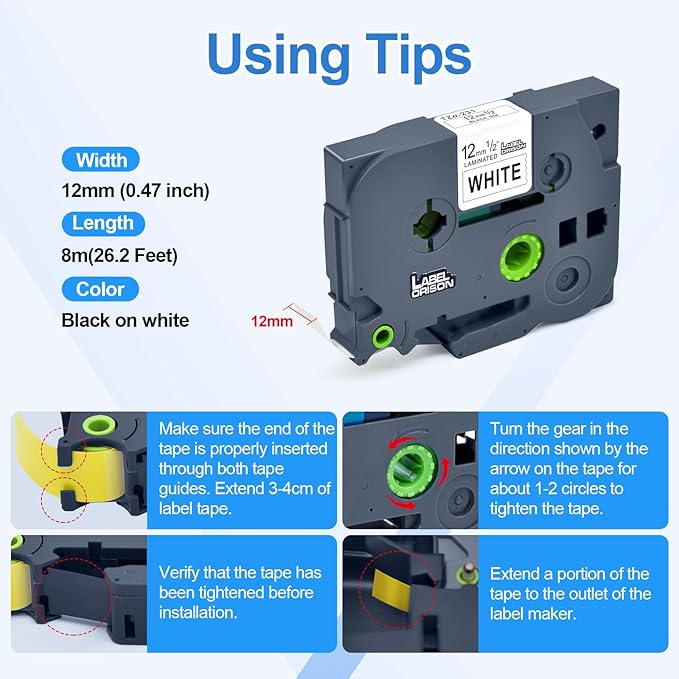 - Color & Dimension: P-touch label tape.Color:black on white;Size:1/2 inch (12mm) widthx26.2 feet (8m)length,long lasting and smooth printing text.4rolls labeling tape packed in a box.
