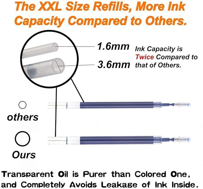 - Larger tube has more capacity that are filled with more ink by widening the refill inner tube, which makesare long lasting. And those pens are non-toxic, acid-free, conform to ASTM D-4236.