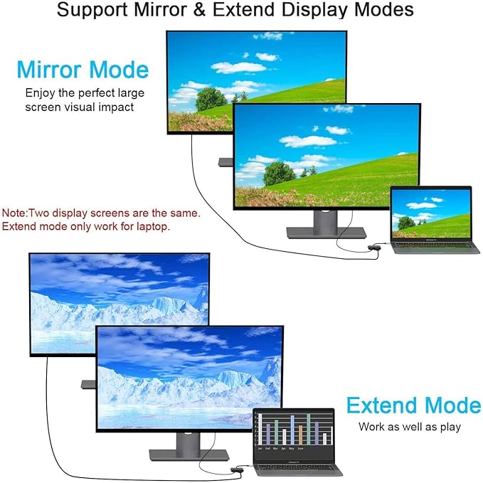 - Dual Monitors Display: USB C VGA HDMI Adapter is design to mirror or extend the screen of laptop, HDMI and VGA port work simultaneously; Allow you to connect hdmi/vga port monitors, displays, tvs. (Noted: Two screens ONLY can extend same images, like A-B/B.)