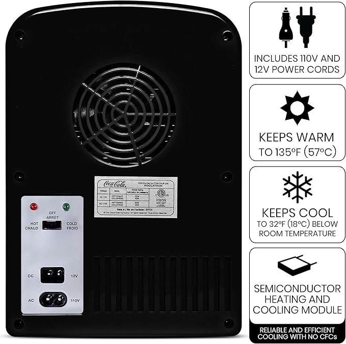 Coca-Cola Zero CZ04 4 Liter/4.2 Quarts 6 Can Portable Cooler/Mini Fridge, Beverages, Baby Food, Skincare and Medications-Use at Home, Office, Dorm, Car, RV or Boat-AC & DC Plugs Included, Black/Red