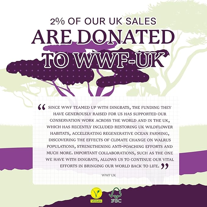 - SUSTAINABLY SOURCED, ENVIRONMENTALLY CONSCIOUS: Made from recyclable materials and FSC certified paper, our notebooks are Vegan Certified. Dingbats* Notebooks Ltd donates 2% of UK sales to WWF-UK, supporting environmental conservation.