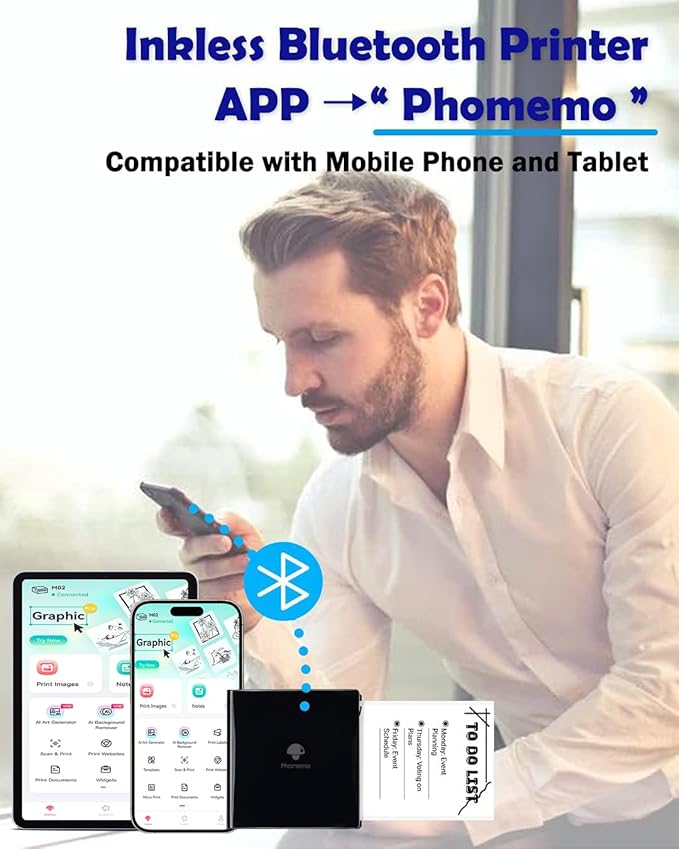 - Bluetooth Thermal Printer- Bluetooth 4.0 connection. System for Android 7.0 and iOS 13.0 or above. Phomemo M02 pocket printer is an inkless printer, you don’t need to buy any ink or toner. Portable mini printer help you save time