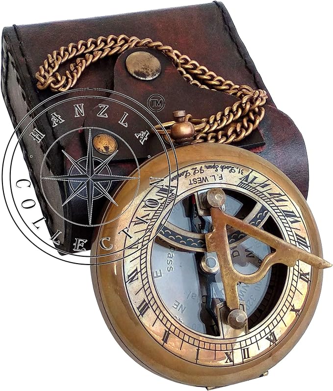- This sundial compass is beautifully crafted from high-quality brass material with push open mechanism. The dimensions of Brass Sundial are : 3 x 3 x 1 inches; & the weight with leather case is 0.250 kg (0.551 Pounds), & comes with 12 inches long brass chain in a handmade leather case. Size of Case : 3.25 x 1.5 x 3.5 Inches Approx.