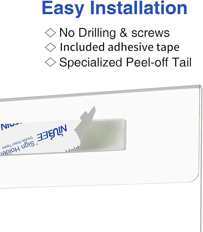 - Easy to install clear acrylic sign holder with powerful permanent adhesive strips.No drilling,no screws required.