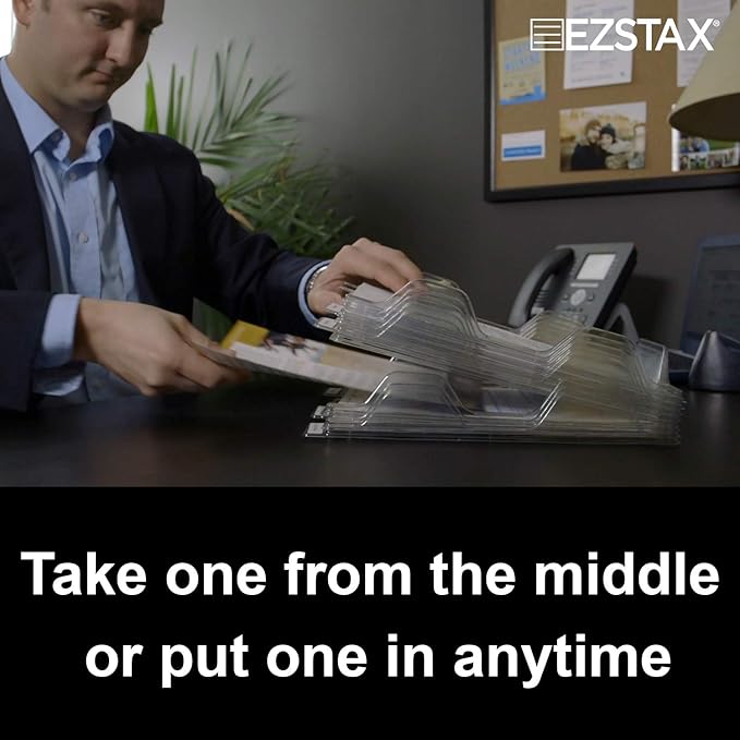 - SMALL PROFILE, HIGH CAPACITY: EZSTAX are thin plastic dividers that can hold up to 200 paper sheets per tray. Designed to be thinner, more functional, and less expensive than traditional desktop letter trays, the stackable trays nest, keeping the overall profile small--saving space on your desk or counter tops.