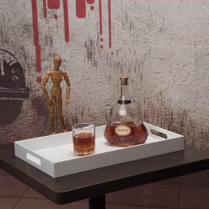Glossy White Sturdy Acrylic Serving Tray with Handles-12x20 Inch-Serving Coffee Appetizer Breakfast-Kitchen Countertop Makeup Drawer Organizer-Vanity Table Ottoman Decorative Tray