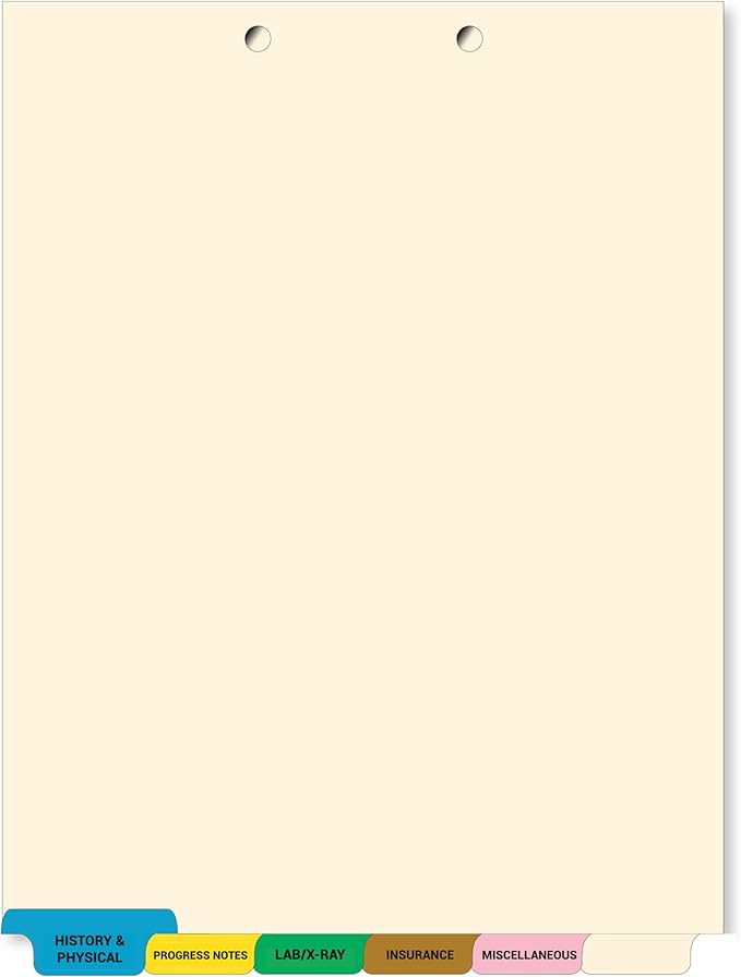 - STAY ORGANIZED: Medical chart dividers sets help organize patient charts, files, or records with standard inserts and common mylar colored tabs to match existing files and maximize efficiency of your healthcare practice . These durable bottom index tab reinforced separators come with file holes and are compatible with standard medical chart fasteners, ring binders and docuclips.