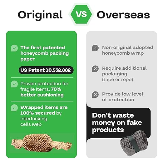 - FIRST AND ONLY PATENTED HONEYCOMB PAPER: The only authentic, 100% original HexcelWrap honeycomb packing paper. Proudly made in the US. Brown color. Size: 50# kraft paper roll, 15.25-inch wide and 300 feet long when expanded, in a self-dispensed box made from recyclable cardboard. The weight is 5 pounds