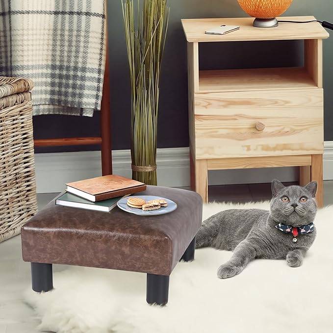 Joveco Small Footstool Ottoman Upholstered PU Leather Square Footrest Ottomans Small Foot Rest for Desk Couch Living Room Bedroom Office (Brown)