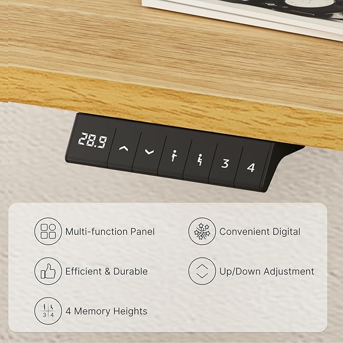 - 4 MEMORY BUTTONS: Easily switch between sitting and standing positions with our 6-button digital controller that features 4 programmable memory presets. The motorized height-adjustable system adjusts smoothly from 28.1” to 45.7”, and the motor runs quietly at less than 50 dB.