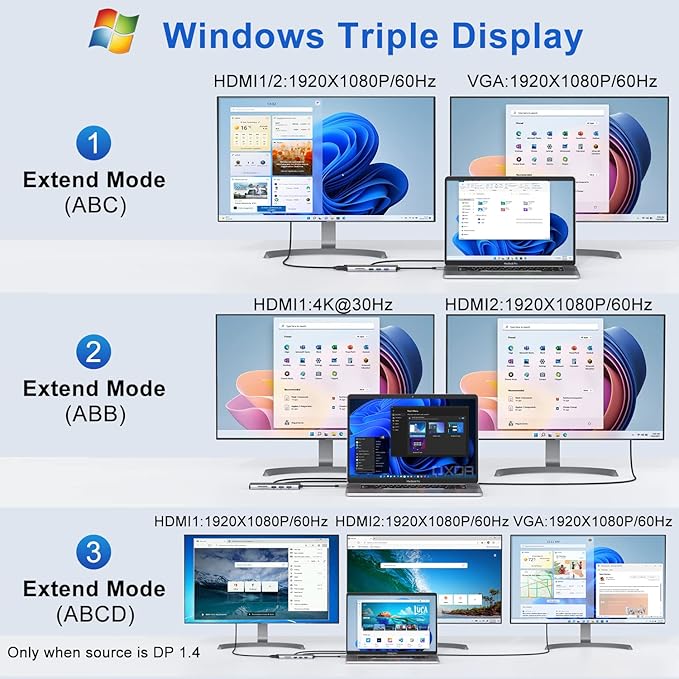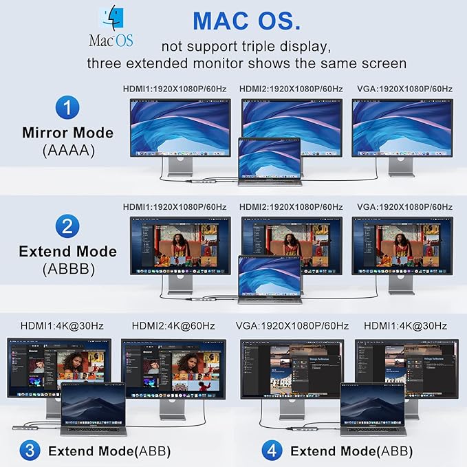 - Triple Display Docking Station: Support SST & MST for Windows OS, you can mirror or extend with crystal clear 3D visual and high quality video experience through 2 HDMI ports and 1 VGA, HDMI resolution will be 4K@30Hz (while DP1.4 source) if two monitors play simultaneously. Display output will be 1080P@60Hz when dual or triple display with VGA. (Single use HDMI 2 can up to 4K 60Hz under DP1.4 source);(❤NOTE: All external monitor images are same on MacOS. due to OS system limit).