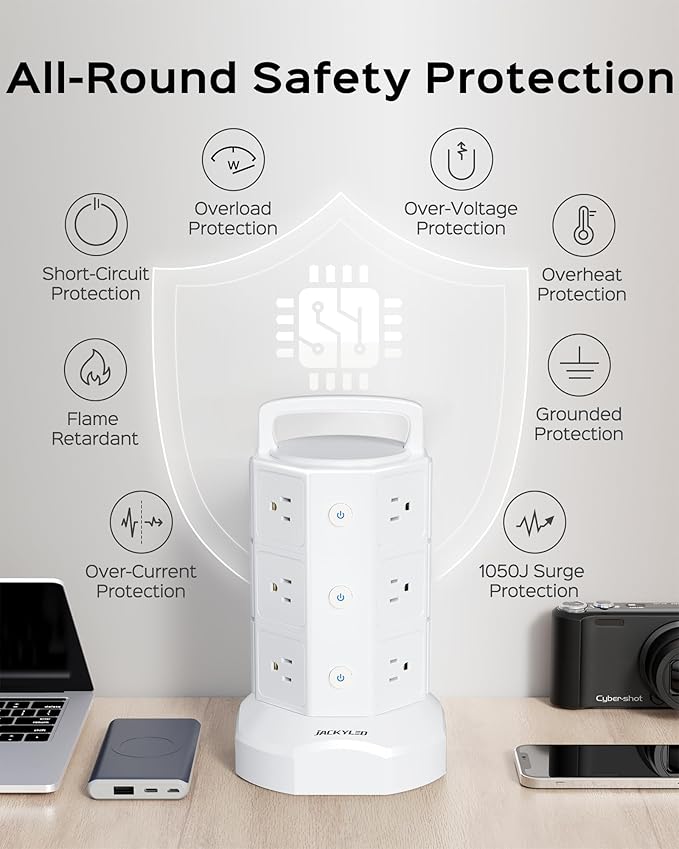 - ▶【Energy Saving and Space Saving】An independent switch is designed on each layer of this power strip with usb ports for you to manage the power of every device you plug in, especially those having on switch on them; efficient in power management with indicator inside switch to check its working status, saving those unnecessary waste of electricity. Besides, the vertical tower design of the power tower helps you save space, and keep your desk neat and tidy.