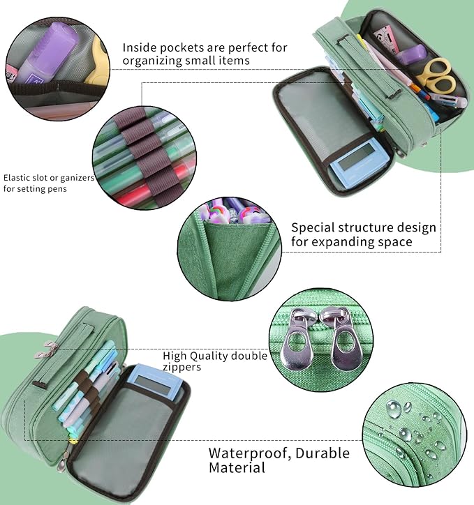 • Multi-storage – Two double-zipper openings with 10 mesh pockets, 7 pens elastic loops, 2 inner zipper pockets, will definitely keep all stuff neat tidy; can hold 60-80 pens or similar items