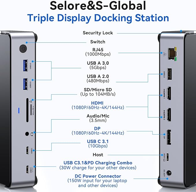 USB C Docking Station 3 Monitors Laptop Dock Dual Monitor with 2 HDMI DisplayPort 4K144Hz,USB A 2.0/3.0,USB C 3.1 10Gbps&30W Output,Ethernet,MicroSD&SD,Audio&Mic,150W DC Power for Dell/Lenovo/HP