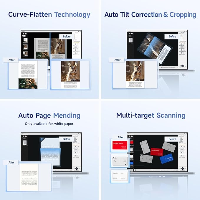 - Patented Flattening Curved Book Page Technology: Shine Ultra applies CZUR’s patented technology to flatten the curved surface after pixel transformation to flattening of the book page (Only suitable for thinner books, ET series is recommended for thicker books)