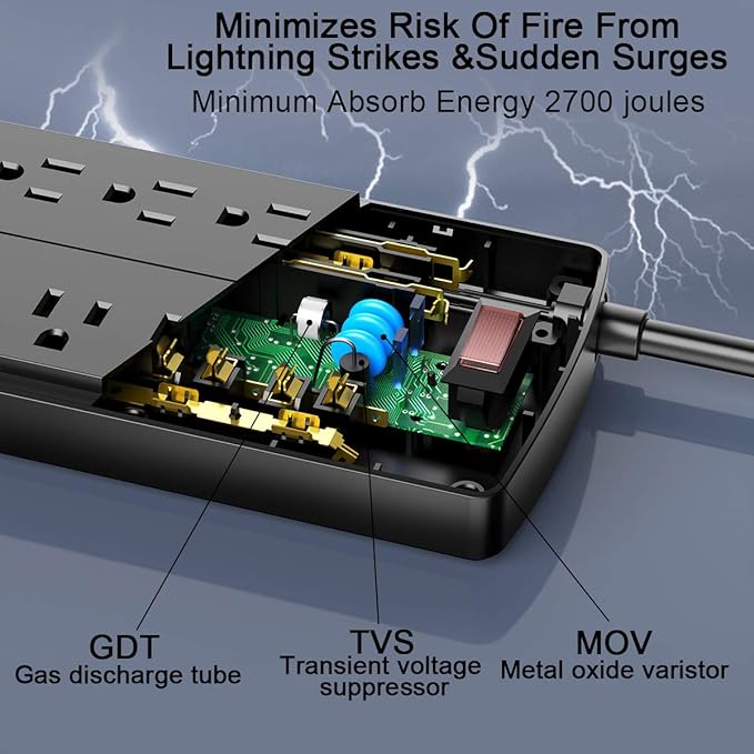 - 【12 AC Surge Protector Outlets】- The 3 level complementary Surge Protector Circuit which composed of TVS (transient voltage suppressor), MOV (metal oxide varistor), GDT (gas discharge tube), with minimum 2700 Joules energy absorbing capacity, could protect your devices much more quickly and reliably than other brand’s 1 level MOV Surge Protection Circuits.
