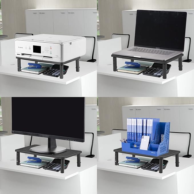 - 【STURDY MATERIAL】- Large 370 x 235mm durable metal shelf fit most flat screen display, laptop and printer, maximum support weight up to 20kg. Anti-skid rubber pads prevent slipping or damage to your work surface. Sleek modern black design complements any desk while adding extra space underneath the stand for storage.