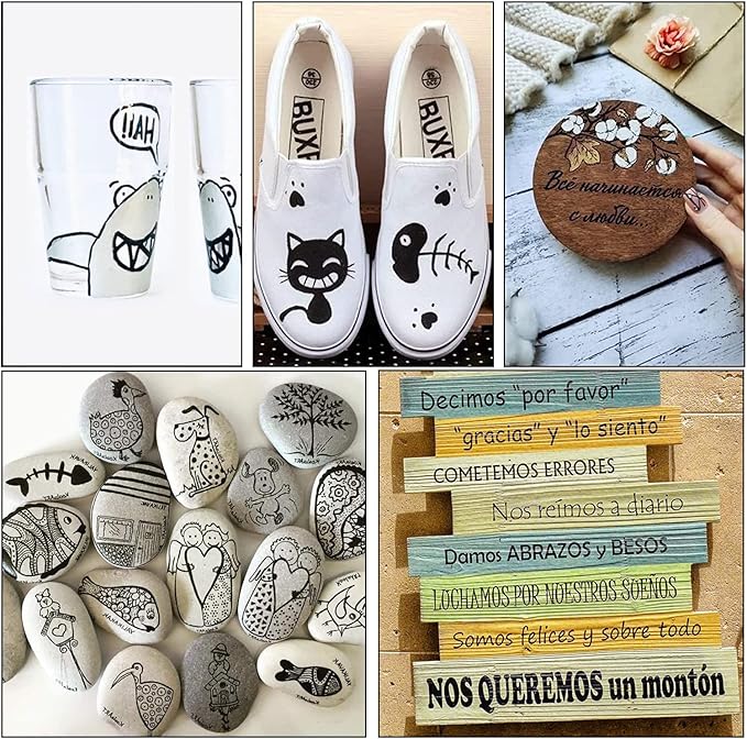 - WORKS ON ALMOST ANY SURFACES: The black paint pens works on almost any surfaces such as rock, canvas, wood, metal, glass, ceramic, plastic, tire, etc. They are the best tool for creativities