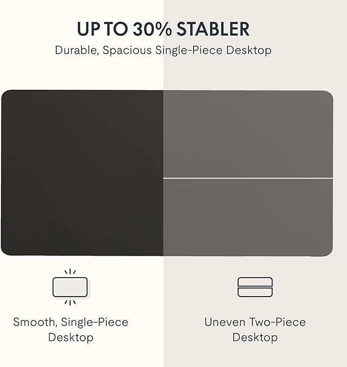 - AMPLE WHOLE-PIECE DESKTOP: With its whole-piece 1” eco-friendly desktop, this standing desk provides plenty of room for your computer setup, documents, and accessories, creating a well-organized and productive work environment. Due to hand measurements, desktop dimensions may vary slightly by 0 to 1”.
