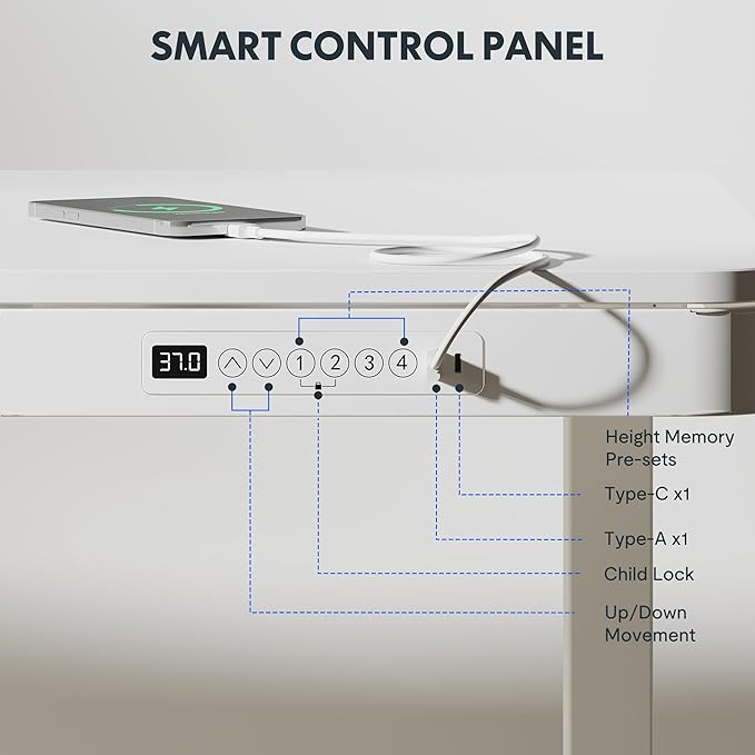 - Embedded Multiple Functions: Easily save multiple with four programmable height presets. Charge up to two devices with integrated USB ports (45W Type-C and 27W Type-A) without mess & hassle. (Note: USB ports may pause charging while adjusting desk height, Laptop charging is not supported).