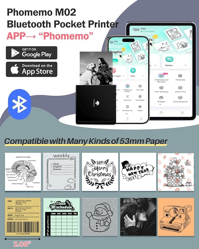 - Multi-Purpose Mini Printer- Phomemo M02 mini sticker printer is suitable for company business, work planner, office assistant, memo, study notes, shopping list, receipts, bookmarks, greeting cards, alphabet learning, coloring and so on. You can use it for DIY, study, fun, labels and create more