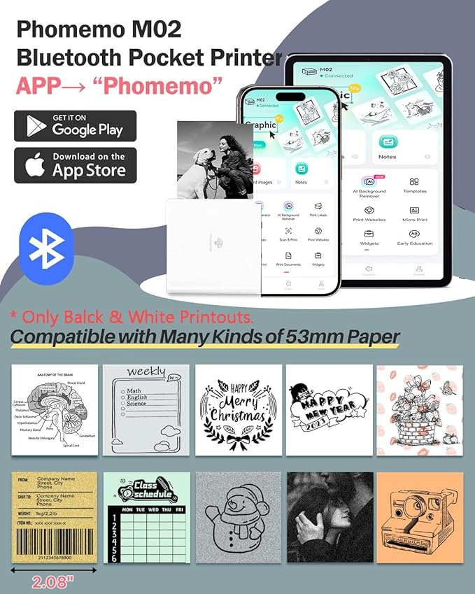 - Bluetooth Mini Thermal Printer- for cell phones and tablets with Bluetooth connectivity, compatible with Android 7.0 and iOS 13.0 or above.The Phomemo M02 sticker printer machine is an inkless wireless printer, you don't need any ink or toner. Not only is it suitable for white self-adhesive and thermal paper (only black and white colors can be printed), but it can also print patterns and text on colored and transparent paper rolls (special paper rolls can be printed in a single color)