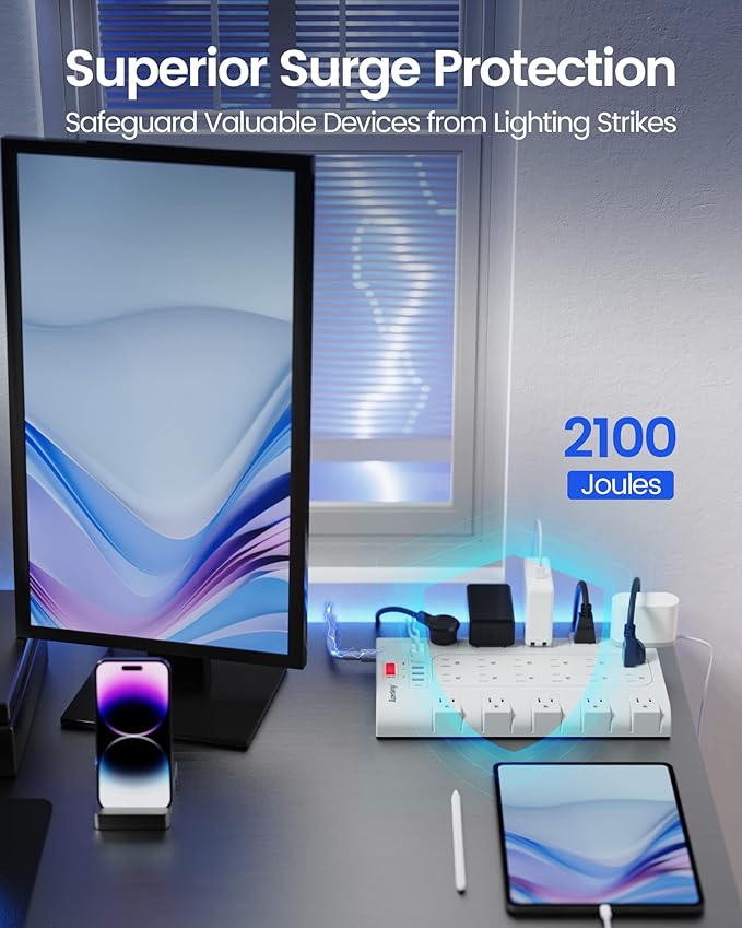 - 【28-in-1 Versatile Power Strip】 FCC, RoHS safety certified, with extension cord and flat plug certified by UL. Superdanny power strip surge protector has 22 grounded 3-prong outlets and 6 USB ports, providing power for all devices that you need to plug in at one location. Perfect for gaming or media set up, surround sound system, TV, phone, tablet pc, laptop, computers, lamps, and other devices simultaneously.