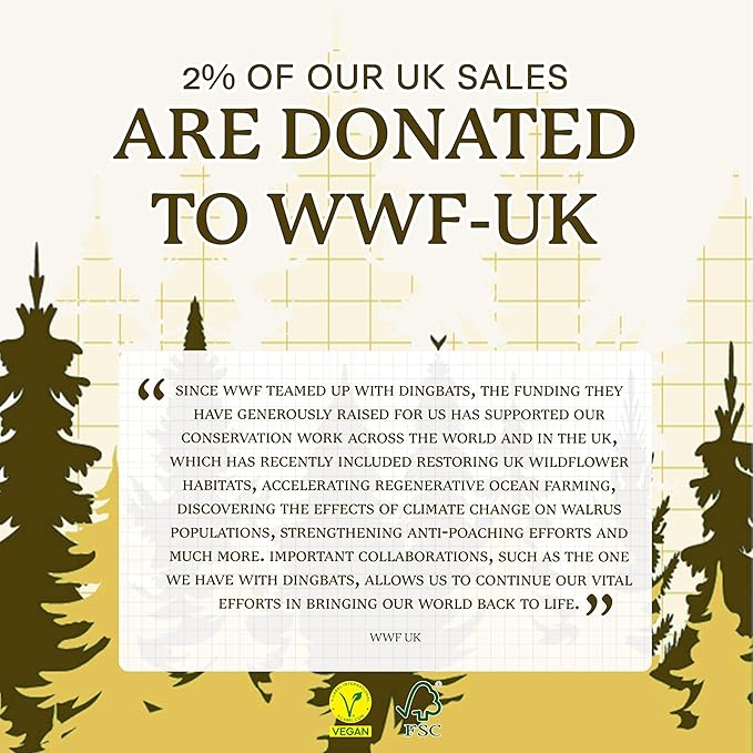 - SUSTAINABLY SOURCED, ENVIRONMENTALLY CONSCIOUS: Made from recyclable materials and FSC certified paper, our notebooks are Vegan Certified. Dingbats* Notebooks Ltd donates 2% of UK sales to WWF-UK, supporting environmental conservation.