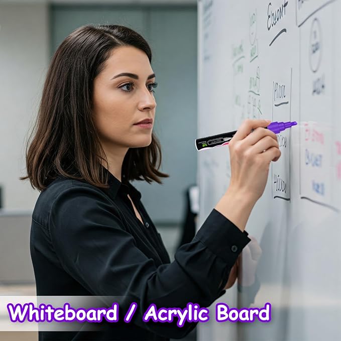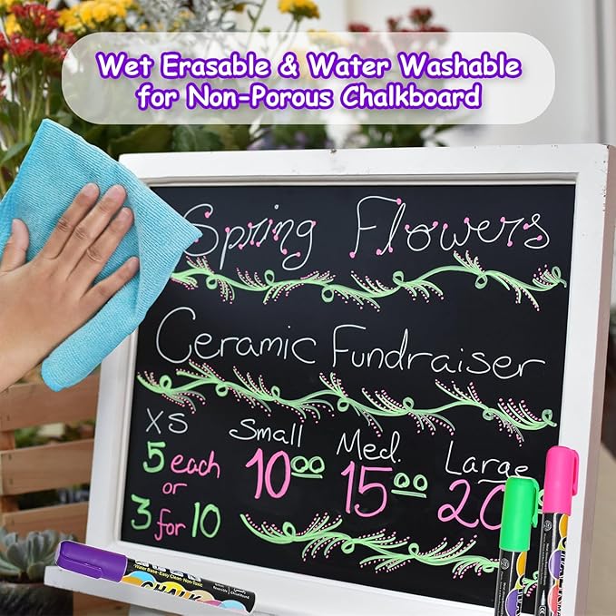 - Easy to Clean: Designed to wipe clean with a damp cloth and water, these markers work seamlessly on non porous chalkboards, bistro boards, blackboards, whiteboards, glass boards, mirrors, acrylic boards, car windows, wall planner, acrylic calendar and more. They’re ideal for creating dynamic event signage, teaching lessons, or updating daily planners with ease