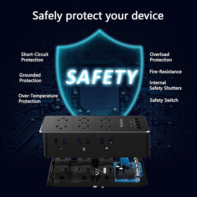 - Multiple outlet wall plug safety warranted: Fireproof material, surge protection 1080J plus grounded protection, overload protection, short-circuit protection, over current protection, over-voltage protection and overheating protection.