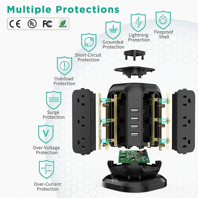 - 1200J Enhanced Safety Features: Power strip surge protector has passed FCC, RoHS certification, this surge tower has surge protection, overload protection, short circuit protection, lightning protection. The power tower charging station use the ceramic SPD to automatic cut off the power fastly when voltage surge is detected, to ensure you a safe charging environment; The power tower has a reset button, in case the maximum voltage is exceeded and the unit shuts down