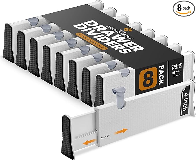 RAPTUROUS 4" Tall Drawer Dividers, 8-Pack, 11-17" Long, Expandable & Adjustable, Strong & Sturdy Non-Slip Dividers for Dresser, Closet, Kitchen, Nursery, and Office (White)