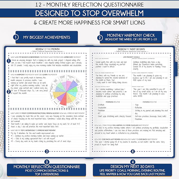 - HABIT TRACKER JOURNAL - Reduce overwhelm, tension, and procrastination by using a groundbreaking 8-step technique to reclaim your life's balance, clarity, and serenity while achieving your goals. Seize the potential of each day. This personal organizer dedicates a separate page for every day, featuring sections for scheduling, goal setting, prioritization, task lists, reflection, and ample space for notes. With its expansive large format, you possess all the room necessary for comprehensive planning.