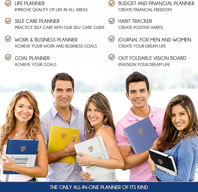 - UNDATED PLANNER - All the tools for success you need to create the life you've always wanted. This large planner measures A5 (8.5 x 6 inches) and boasts thick 100 gsm paper. It features a Vertical Planner layout, offering 256 pages for life transformation, including 53 weekly spreads, 12 monthly planning overviews with reflection sections, 31 dotted journal pages, habit trackers, mind maps, morning and evening routines, inner pockets, pen holder, and comes in a gift box. The planner comes with 539 productivity stickers that can be used to mark important dates, tasks, or milestones. This life planner is UNDATED giving you the freedom to start your journey whenever suits you best