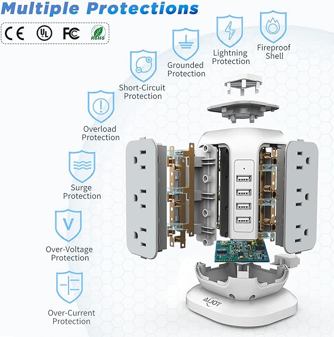 - Widely Use in Office College or Home and Dorm: Multiple outlets plug charging tower for multiple devices can be used for your PC, computer, laptop, phones, tablet, TV, printers, speakers, rice cookers and other devices; You can also take it to travel because it supports wide voltage; Please do not exceed the rated power 1250W ~ 125V (2500W ~ 250V)