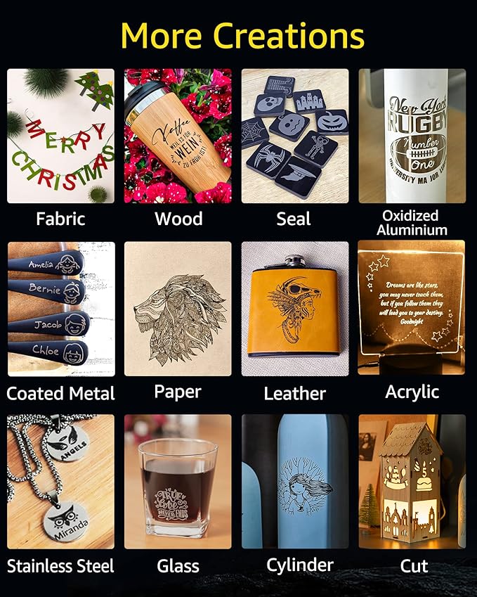 - CAN engraves: Paper, Cardboard, Wood, Leather, Coating metal, Brushed stainless steel, etc. Can cut Wood, Paper (thickness within 0.2 "). CAN NOT engraves: Pure metal, shiny metal, etc. ATTENTION: The LP2 is limited in the metal materials it can engrave, if you mainly engrave metal, please choose the LP3 or LP4. Light color or transparent material will reflect laser, paint/spray it black before engraved and wipe when jobs done