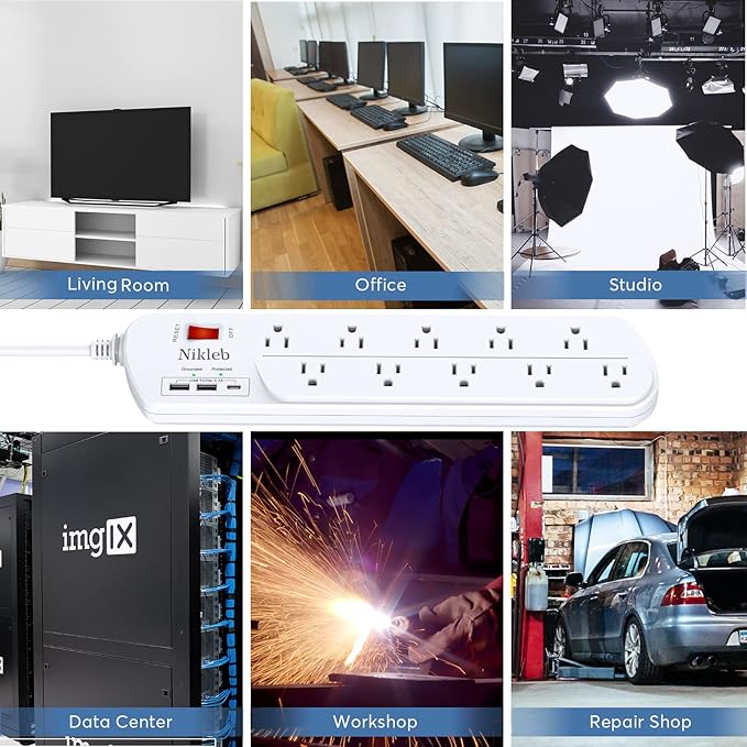Long Power Strip, Multi Plug Outlet Extender Nikleb with 10 Outlets, Heavy Duty Extension Cord with 2 USB+1 Type C Ports, USB Plug Adapter Surge Protector for House, Garage, Patio, Basement