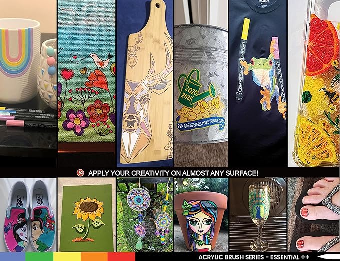 - ✔️FLEXIBLE BRUSH TIP – The pens are ready to paint without having to shake and prime the tips like traditional paint pens. The flexible brush tip makes color blending easier and can vary from a thin 1mm up to a bold 7mm line width, depending on the pressure applied. Paint pens are great for avoiding the mess that typically comes with cleaning brushes and pouring paint and are easy to travel with.