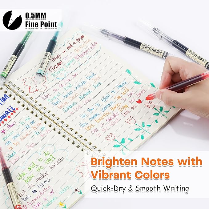 - SMOOTH FLOWING INK – With a built-in precision ink regulator, these pens deliver steady, even liquid ink flow. Whether scribbling quick ideas, writing long notes, or sketching delicate lines, it prevents skips, blobs, or dry spots. Adapting to your pace, fast strokes stay clear, slow work crisp—no oversaturation. Consistent flow makes writing effortless, enhancing tasks from lists to creativity without interruptions.