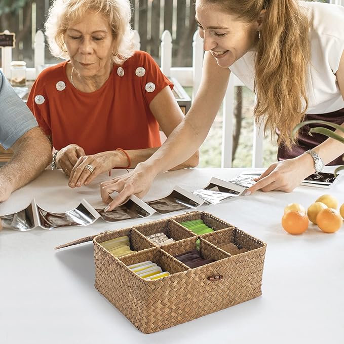 Tea Bag/Sugar Packet Holder, Coffee Station Condiment Organizer, Seagrass Storage Basket, Wicker Rattan Divided Basket Organizer for Drawer/Shelf/Countertop