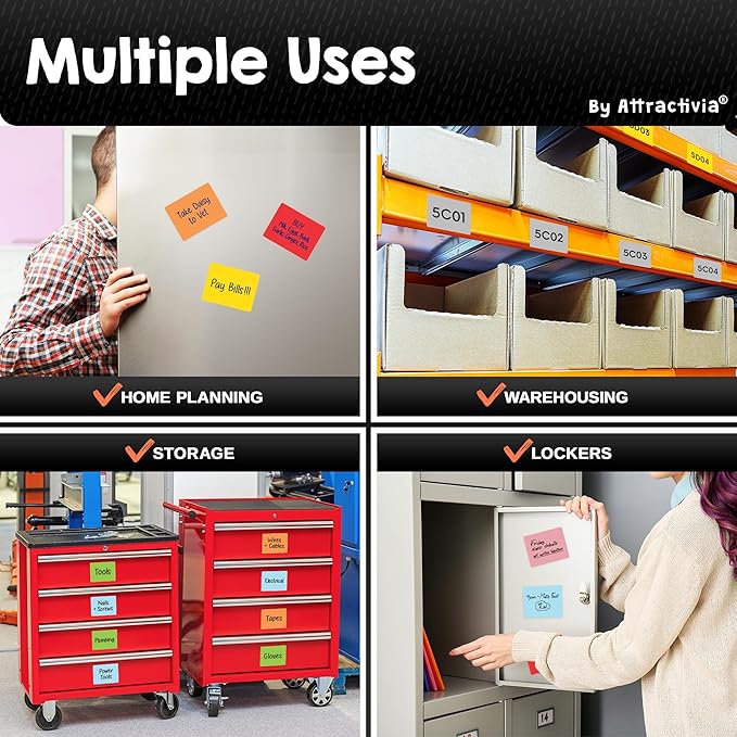 - Premium Quality: Our magnetic labels for whiteboard feature a white, dry erasable front, ensuring smooth writing and easy wiping. No more ghosting, streaks, or dull markings. Every message stays clear and professional with our magnetic labels for shelving. Each label measures 3.7 x 2.8 inches.