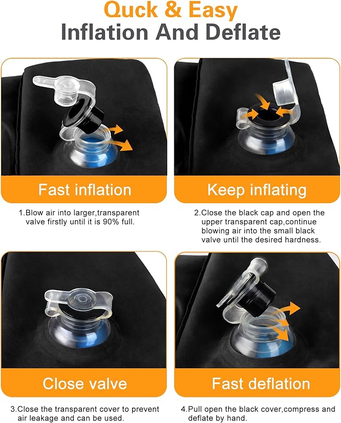 - Very User-Friendly Design: Our inflatable foot rest pillow with 2-in-1 double valve,the upper black air valve is a one-way air inlet for inflating or replenishing gas.bottom transparent air valve can be quickly inflated and deflated,when you are done blowing it up, push clear cover on and push whole valve in so that it is flush with the side of the travel foot pillow,the airplane footrest takes away the hassle of bringing a pump and making noise in flight.