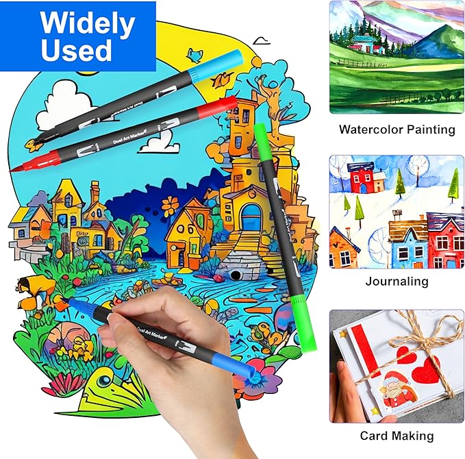 - 🎨Dual Brush Marker Pens: The coloring markers have a dual tip design with a 1-2mm brush tip and a 0.4mm fine tip, allowing you to create medium or bold strokes by varying the pressure of the brush, while experiencing fine strokes with the fine tip.The 0.4mm fine tip markers are great for sketching, tracing, and detailing, while the 1-2mm brush tip markers are great for giving large areas of color. The dual-head design fully meets your needs in different situations.
