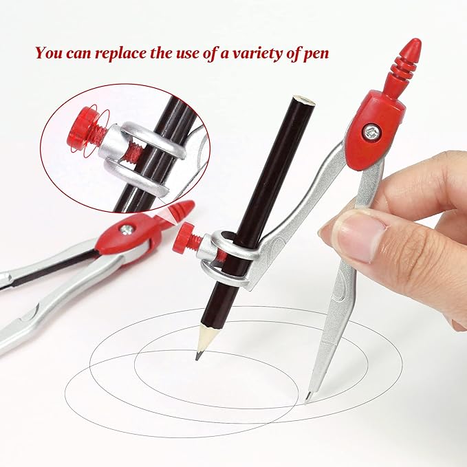 - A Practical Compass Geometry Set:Long-Lasting metal compasses will not bend, Ergonomically designed compass head is comfortable to hold, Universal Holder Compass work with any standard sized pencil or pen