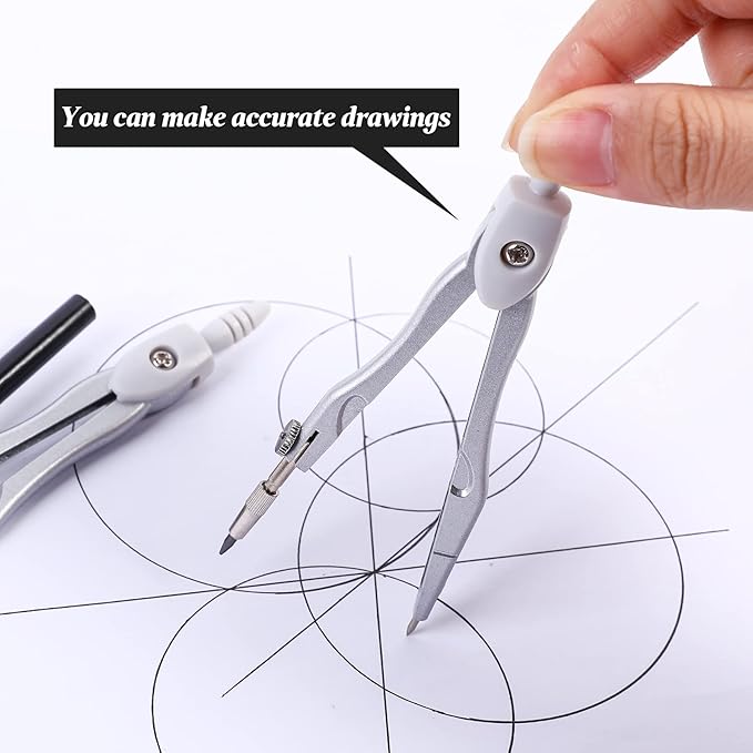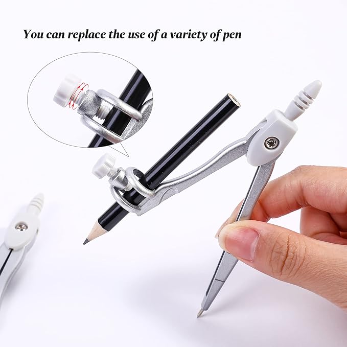 - A Practical Compass Geometry Set:Long-Lasting metal compasses will not bend, Ergonomically designed compass head is comfortable to hold, Universal Holder Compass work with any standard sized pencil or pen