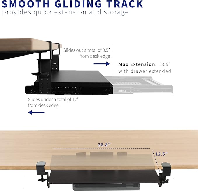 - Save Desk Space: This 26.8” (32.5” including clamps) x 11” under-desk keyboard tray holds your keyboard and mouse below the desktop for added work space. The 17” pencil drawer provides extra storage for small accessories