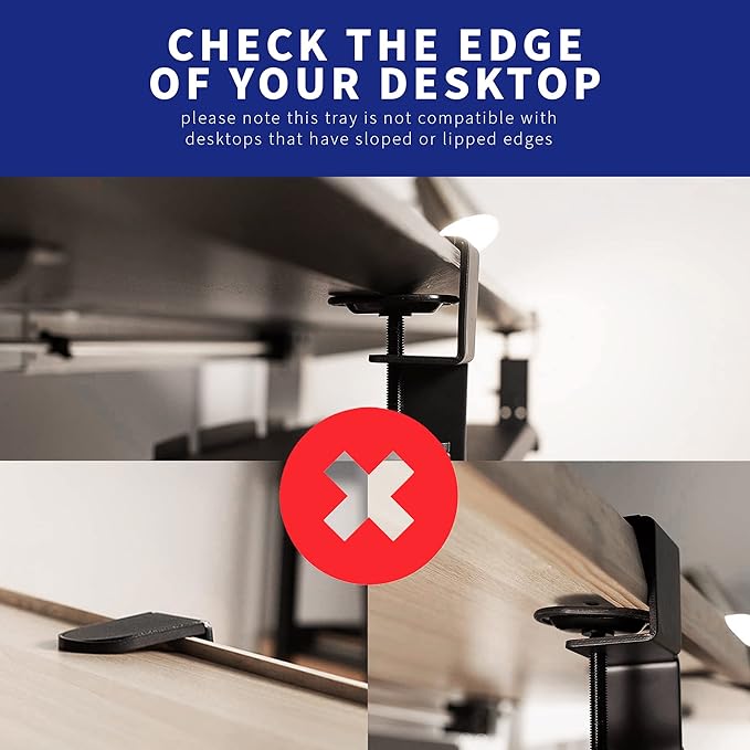 - Capacity: The tray holds weights up to 11 lbs and sits 1.5” to 5.75” below the desk (depending on your table thickness). Please Note: This tray is not compatible with desktops that have beveled edges